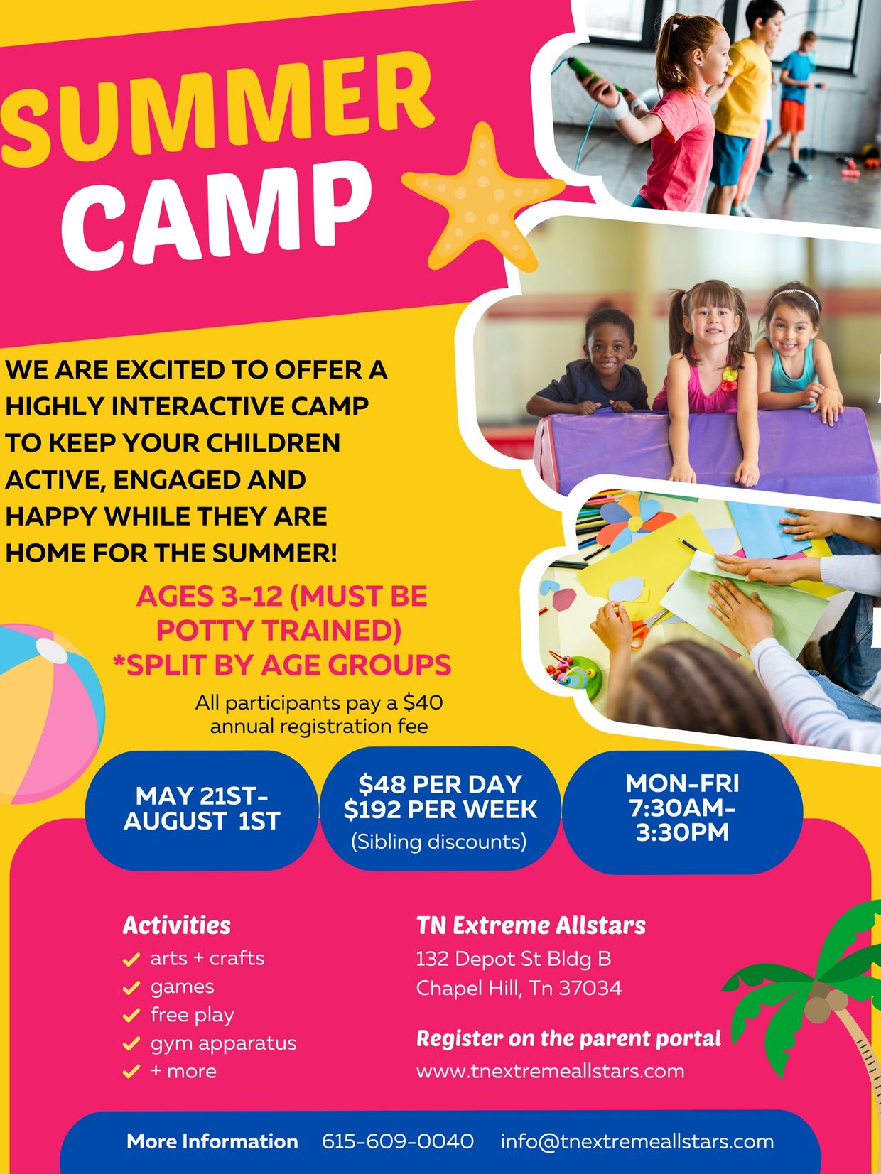Join us for our fun and interactive summer camp! Summer camp is for ages 3-12 years old and children must be independently potty trained. Camp is ran Monday - Friday, May 21st through August 1st. Campers are divided into groups by age. You may sign up for a single day, an entire week, or any combination of days. Each week is themed and activities will correspond with that weeks theme. Campers should bring: lunch, 2-snacks, and refillable water bottle.